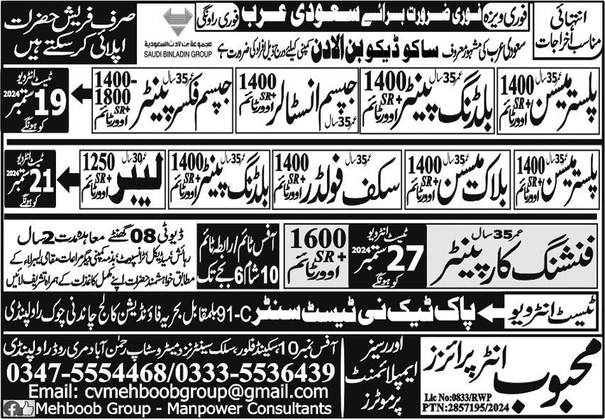 Mehboob Enterprises Overseas Employment Promoters is looking for candidates for following posts as per job advertisement published in daily Express Newspaper of September 13, 2024 for location Jeddah, dammam Saudi Arabia: