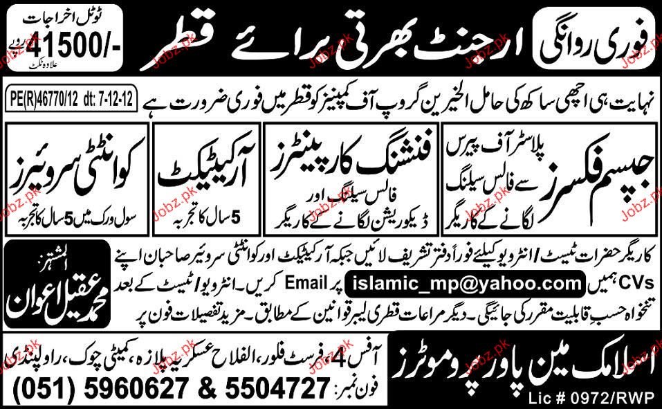 Gypsum Fixers, Finishing Carpenters, Architect Required
