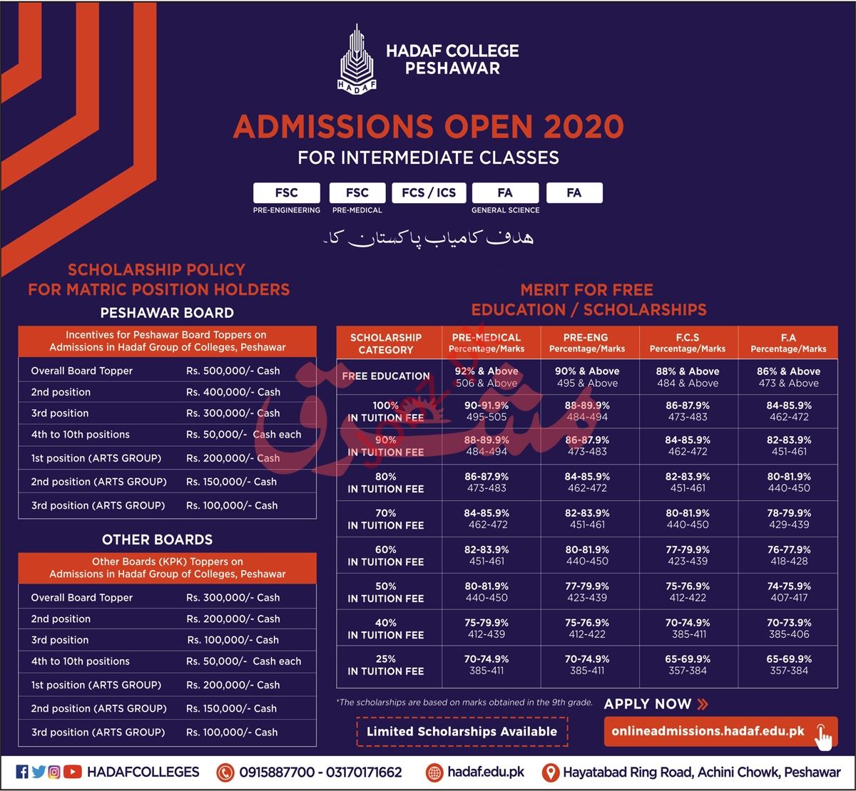 Hadaf College Peshawar, Pakistan is opening admissions fall 2020 for the classes of FA, FA General Science, FCS, ICS and F Sc in Pre Medical and Pre Engineering. Read newspaper ad for exact details.