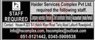 Haider Services Complex invites applications for job positions advertised in daily Jang dated 13 July 2025 for following vacancies in Rawalpindi, rawalpindi Punjab Pakistan.