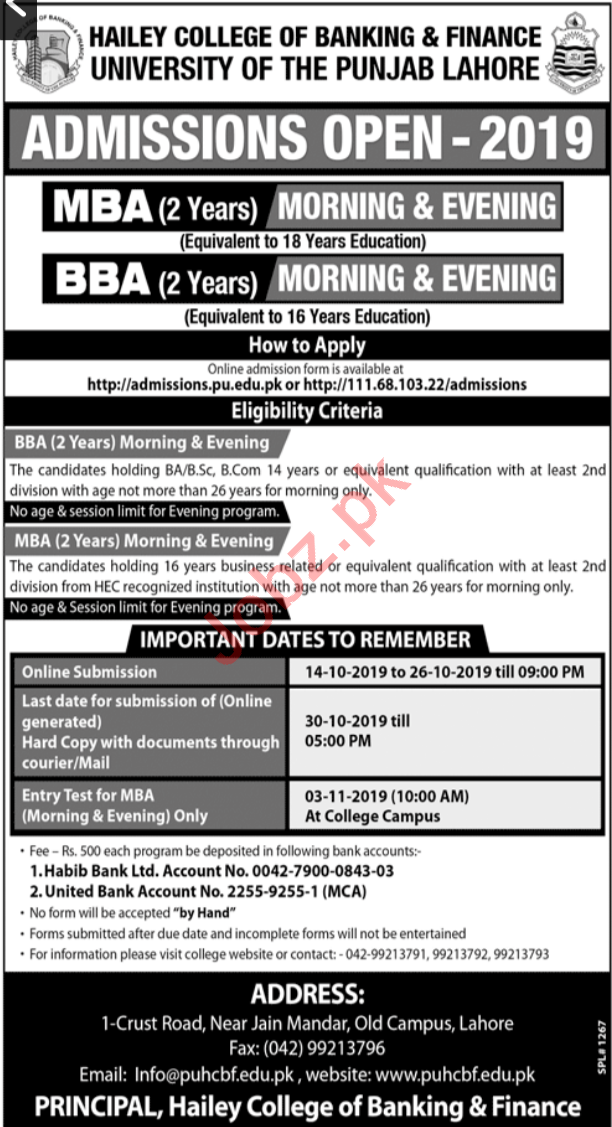 Hailey College of Banking & Finance has announced admissions in MBA, BBA in Lahore. Last date for online submissions is 26 October, 2019. Entry Test for MBA will be take place on 3 November, 2019. Read newspaper ad for exact details.