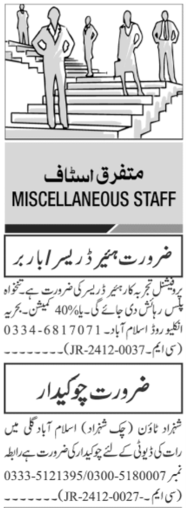 Hair Dresser & Chowkidar Jobs 2024 in Islamabad