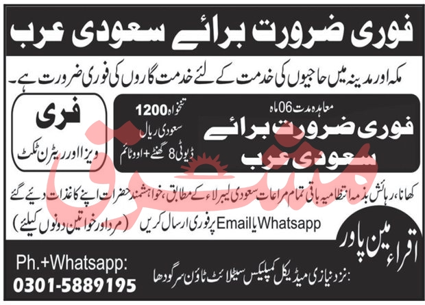 Iqra Manpower Services Makkah, makkah and madina Saudi Arabia invites applications from eligible candidates for the post of hajj servant as per advertisement of January 17, 2024 published in daily Mashriq Newspaper. Preferred Education is Matric and Middle etc.