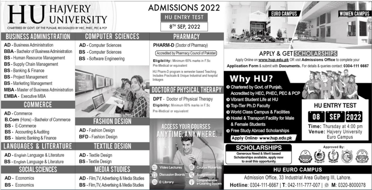 Hajvery University Bachelor Degree in Business Administration, Human Resource Management, Supply Chain Command, Banking & Finance, Project Management, Marketing Management, Master of Business Administration MBA, Executive MBA. Commerce AD Course, B.Com, E.Commercce, Accounting & Finance, Islamic Banking & Finance, Computer Science, Software Engineering, Fashion Design, Textile Design, Film TV, Advertising & Media Studies. Doctor of Physio Therapy DPT. admissions 2022 has been started. Students can enroll for admissions in Hajvery University Lahore Punjab Pakistan for academic year 2022 to continue campus based or online education in Teaching University. Students for admissions in DPT and Bachelor can apply for online or campus classes as per Private institute criteria till admission closing date September 8, 2022. Read newspaper ad for exact details.