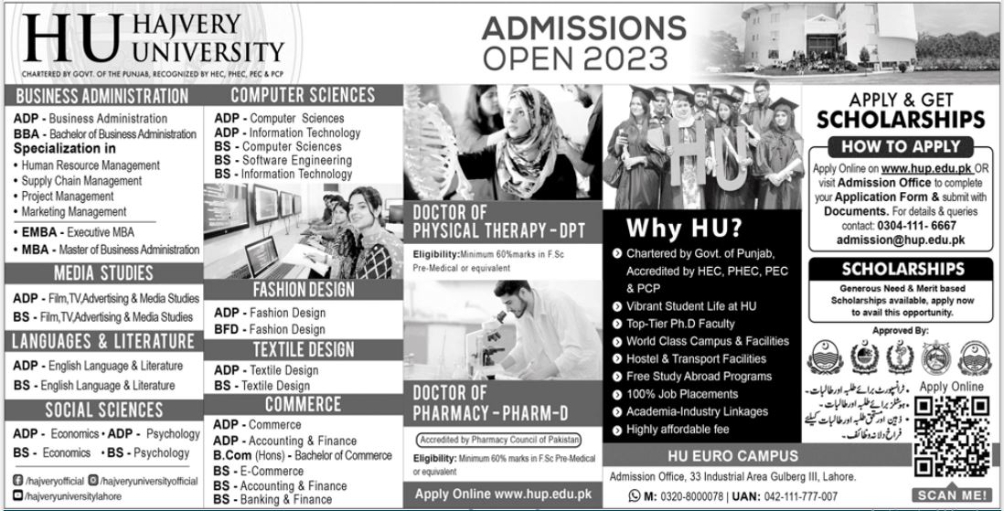 Hajvery University has announced admissions 2023 for ADP, BBA, BS, MBA< MS, Mphil, PhD, Pharm D, DPT. Eligible students who qualify as per admission criteria in Hajvery University Lahore Punjab Pakistan can apply in Science University for academic year 2023. Eligible students for fulfilling criteria for admissions in Mphil, BBA, Phd, BS, Others, MS and MBA can enroll as per Government admission policy 2023 till closing date 25 September 2023. Read newspaper ad for exact details.