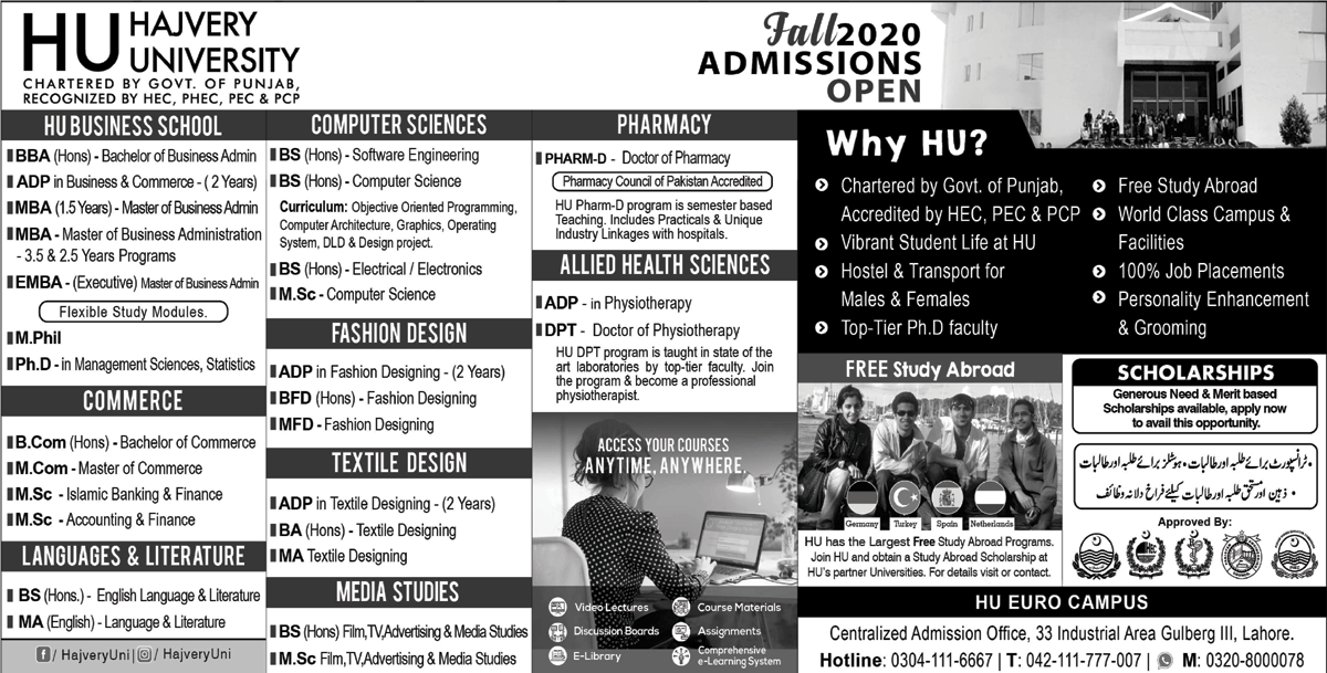 Hajvery University HU is a private university has announced admissions in BBA Hons, ADP, MBA, M.Phil, PhD, B-Com, M-Com, MSc, BS, DPT degree programs in Lahore. Read newspaper ad for exact details.