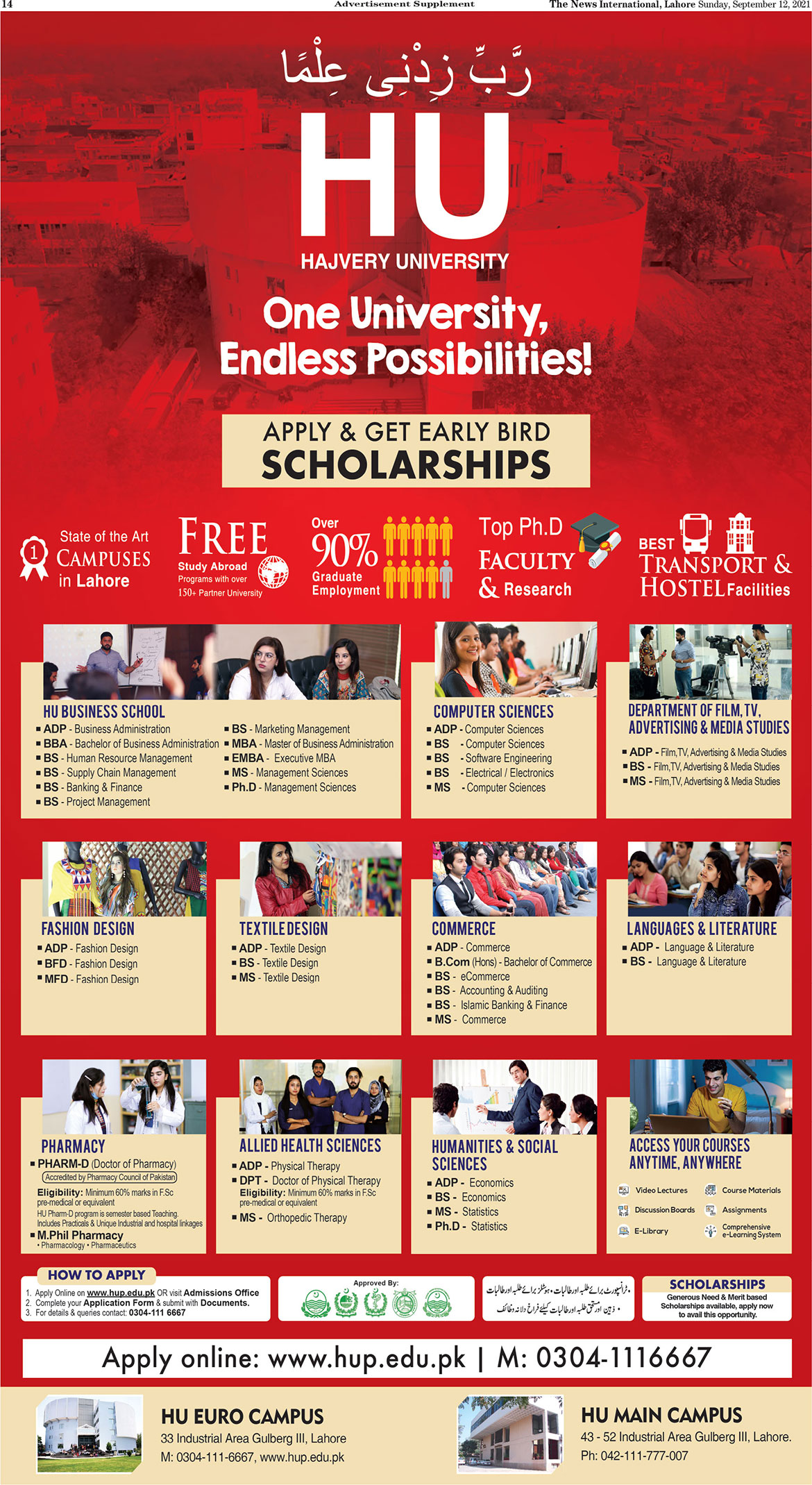 Hajvery University HU is a private sector university has announced admissions in ADP, BBA, BS, MBA, EMBA, MS, PhD, BFD, MFD and M.Phil degree programs in Lahore 2021. Read newspaper ad for exact details.