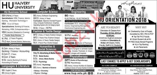 Hajvery University HU is offering admissions for BBA Hons, MBA, M.Phil, B-Com, M-Com, MSc, BS, MA, BFD, MFD, BSCS, BE, Pharm-D, DPT Degree Programs in Lahore & Sheikhupura Campuses. Read newspaper ad for exact details.