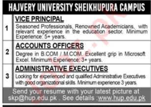 Hajvery University is looking for candidates for following posts as per job advertisement published in daily Jang Newspaper of October 23, 2022 for location Sheikhupura, sheikhupura Punjab Pakistan: