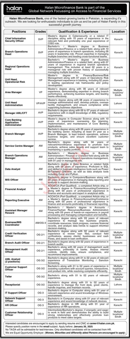 Halan Microfinance Bank HMB Karachi, karachi Sindh Pakistan invites applications from eligible candidates for the post of manager aml, branch operations head, unit head administration, network support officer, hr officer, mis coordinator, area manager, chief information security officer, it support officer, assistant manager reward, manager cft, receptionist, regional operation head, management audit officer, data analyst, customer support officer, unit head operation risk, financial analyst, business coordinator, branch operation manager, service centre manager, reporting executive, branch audit officer, credit verification officer, teller, aml analyst, mis officer, customer relationship officer, core banking application administrator and branch manager as per advertisement of January 19, 2025 published in daily Jang Newspaper. Preferred Education is MS, Intermediate, ACCA, Master, Bachelor and MBA etc.