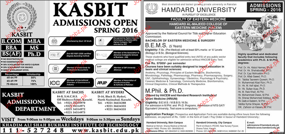 Hamdard University Admission in BEMS, Mphill and Phd in karachi. Read newspaper ad for exact details.