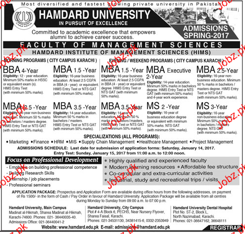 Hamdard University Admission in BBA, MBA and MS in Karachi. Read newspaper ad for exact details.