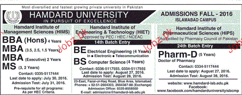 Hamdard University Admission in BBA, MBA, BE, BS, MS and Pharm-D in Karachi. Read newspaper ad for exact details.