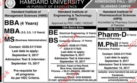 Hamdard University Admission in BBA, MBA, MS and Mphill in Islamaabd. Read newspaper ad for exact details.