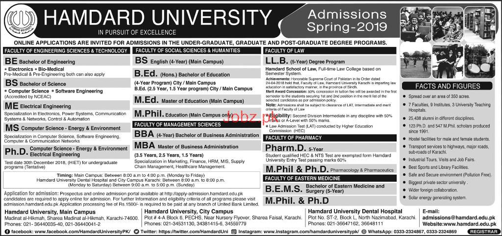 Hamdard University Admission in BBA, MBA, MS, MS, Mphill, LLB Five Year Program, Pharm-D, BBA Four Year Prgram, MS in Computer Sciences, BE in Electronics Engineering in Karachi. Read newspaper ad for exact details.