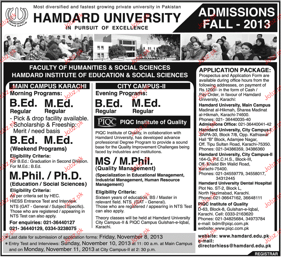 Hamdard University Admission in B.Ed, M.Mphill and Phd in Karachi Read newspaper ad for exact details.