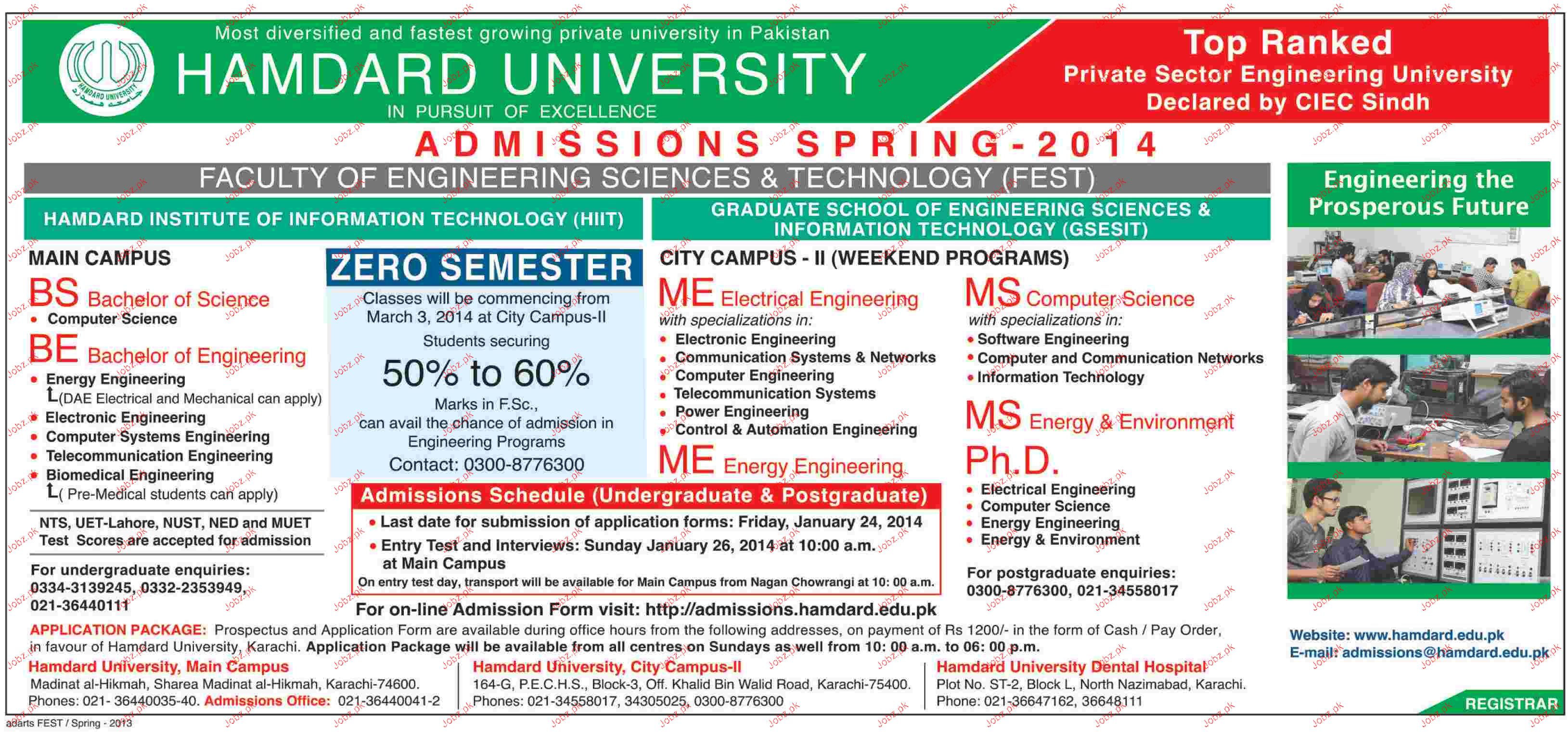 Hamdard University Admission in BS, BE, ME, MS and Phd in Karachi Read newspaper ad for exact details.