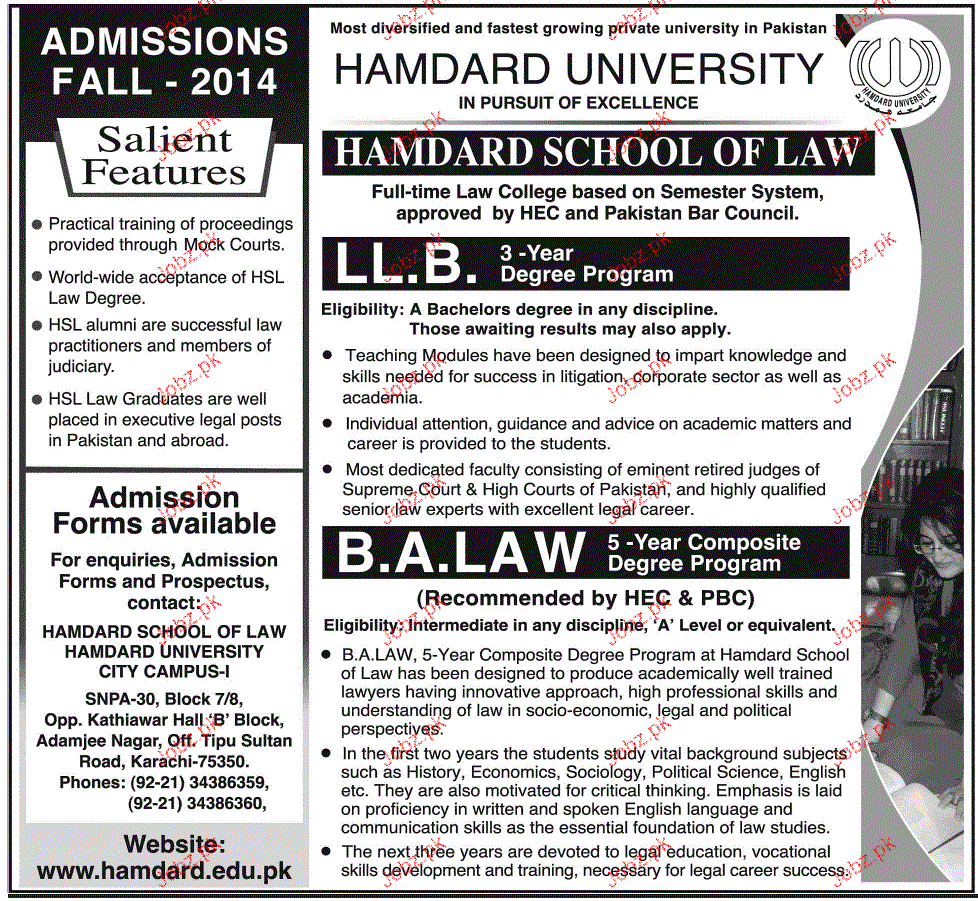 Hamdard University Admission in LLB and BA Law in Karachi. Read newspaper ad for exact details.