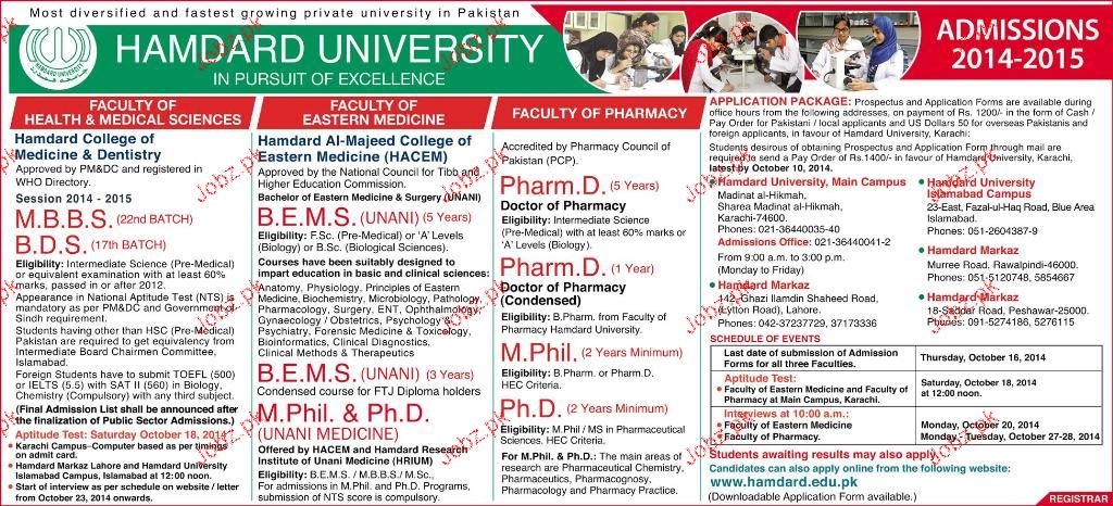 Hamdard University Admission in MMBS, BDS, BEMS, Phd and Pharm-d in Karachi. Read newspaper ad for exact details.