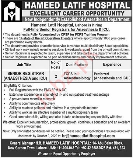 Hameed Latif Hospital Lahore, lahore Punjab Pakistan invites applications from eligible candidates for the post of registrar as per advertisement of September 25, 2022 published in daily The News Newspaper. Educational qualifications required Master and MBBS etc.