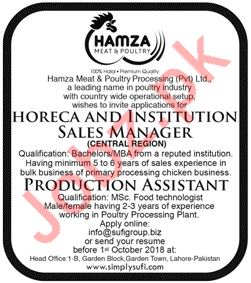 Vacancies in Hamza Meat and Poultry Advertisement September 2018