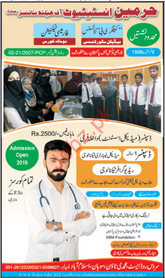 Harmain Institute of Health Sciences is offering admissions in Pharmacy Technician, Dispenser, Dispenser Medical Assistant, Medical Laboratory Technology, Radiographer Technology in Islamabad. Harmain Institute of Health Sciences is recognized from Pharmacy Council of Pakistan and Punjab Medical Faculty. Training will given in Al Razi Hospital and Pakistan Railway General Hospital Rawalpindi. Read newspaper ad for exact details.