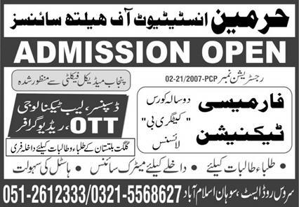 Harmain Institute of Health Sciences has announced admissions for paramedical diploma in Pharmacy Technician, Dispenser, Lab Technology, OTT and Radiographer. Read newspaper ad for exact details.