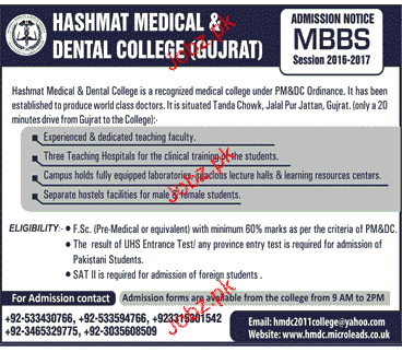 Hashmat Medical & Dental College Admission in MBBS in Lahore. Read newspaper ad for exact details.