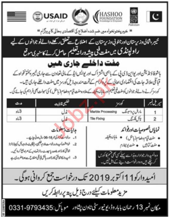 Hashoo Foundation is offering admissions in Marble Designing, Tile Fixing for students of Khyber Agency, North and South Waziristan in Rawalpindi. These courses are free of cost. Read newspaper ad for exact details.