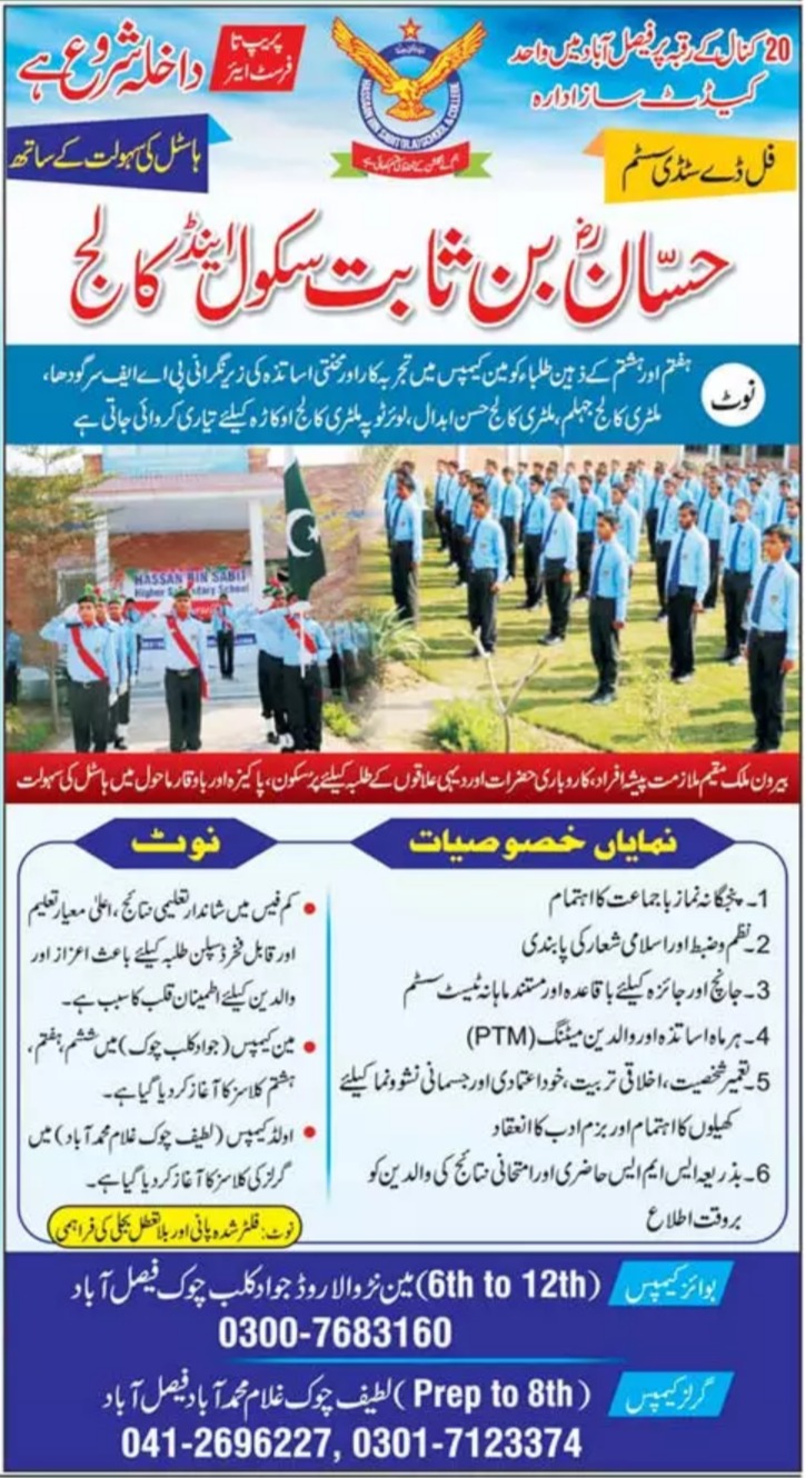 Hassan Bin Sabit Higher Secondary School has announced admissions 2022 for Faculty of Science in Pre-Engineering Pre-Medical and Computer Science.. Eligible students who qualify as per admission criteria in Hassan Bin Sabit Higher Secondary School Faisalabad Punjab Pakistan can apply in Teaching College for academic year 2022. Students for admissions in Intermediate and ICS can apply for online or campus classes as per Private institute criteria till admission closing date August 31, 2022. Read newspaper ad for exact details.