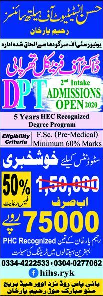 Hassan Institute of Health Sciences affiliated with University of Sargodha has announced admissions in Doctor of Physical Therapy DPT 5 Years degree program in Rahim Yar Khan. Read newspaper ad for exact details.