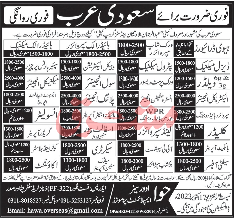 Hawa Overseas Employment Promoter invites applications for job positions advertised in daily Mashriq dated 16 October 2023 for following vacancies in Riyadh, riyadh Saudi Arabia.