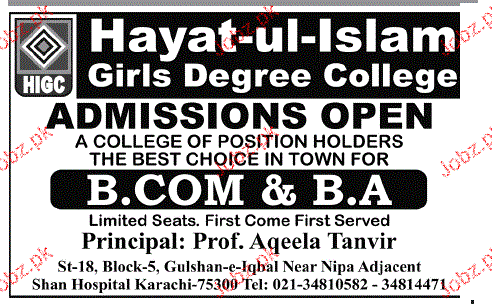 Hayat Ul Islam Girls Degree College Admission in BA and BCom in Karachi Read newspaper ad for exact details.