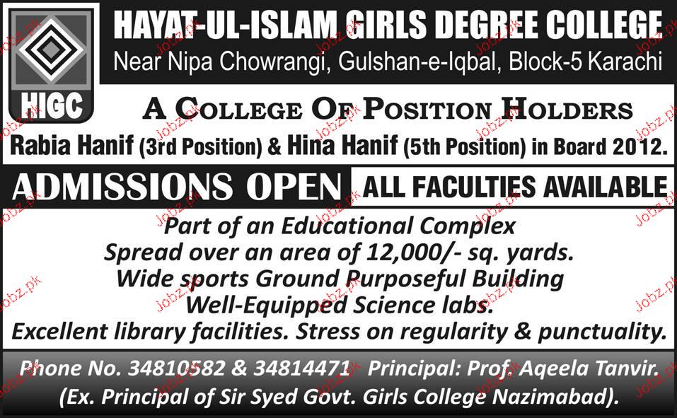 Hayat Ul Islam Girls Degree College Admission in BA in Karachi Read newspaper ad for exact details.