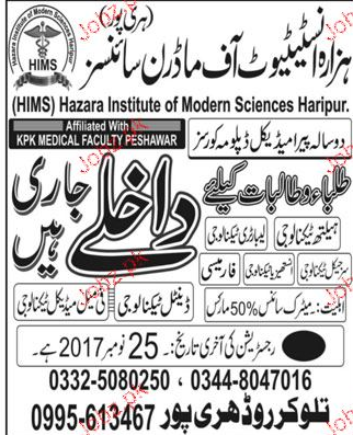Hazara Institute of Modern Sciences Admission in 2 Year Para Medical Courses Health Technology, Laboratory Technology, Surgical Technology and Dental Technology in Haripur. Read newspaper ad for exact details.