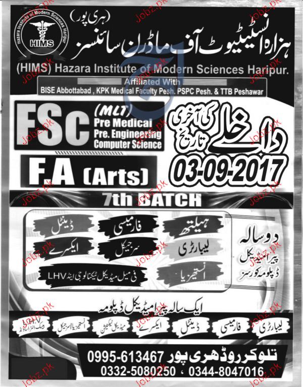 Hazara Institute of Modern Sciences Admission in Fsc and FA in Hirpur. Read newspaper ad for exact details.