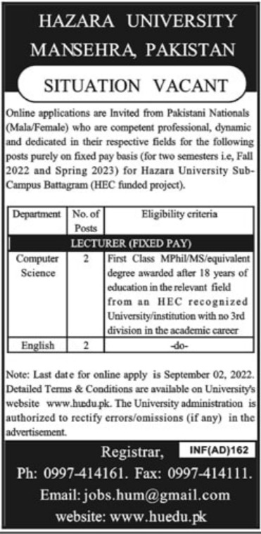 Vacancies in Hazara University Advertisement August 2022