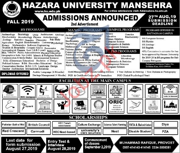 Hazara University has announced admissions in BS Biology, Urdu, Biochemistry, Physics, English, Zoology, Pak study, Mathematics, Software Engineering, Economics, LLB, BBA, MA Urdu, English, MSC Psychology, MA Mathematics, Pak study, MS/MPhill Botany, Education, Computer Science, Management Sciences, PhD in Botany, Microbiology, Mathematics & Statistics, Management Science, Computer Science in Hazara University Mansehra. Read newspaper ad for exact details.