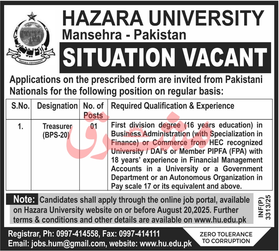 Hazara University invites applications for job positions advertised in daily Mashriq dated 31 July 2025 for following vacancies in Mansehra, mansehra Khyber Pakhtunkhwa KPK Pakistan.