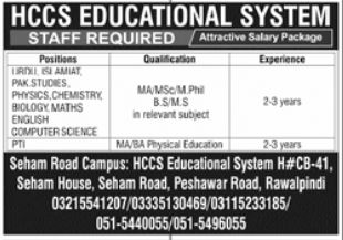 HCCS Educational System jobs advertisement dated about 16 February 2025 in daily Jang Newspaper invites application for the vacant post of urdu teacher, english teacher, maths teacher, pti, pak studies teacher, chemistry teacher, islamiat teacher, computer science teacher, biology teacher, teacher and physics teacher in Peshawar Road Rawalpindi, rawalpindi Punjab Pakistan. Educational qualifications required Master and Bachelor etc.