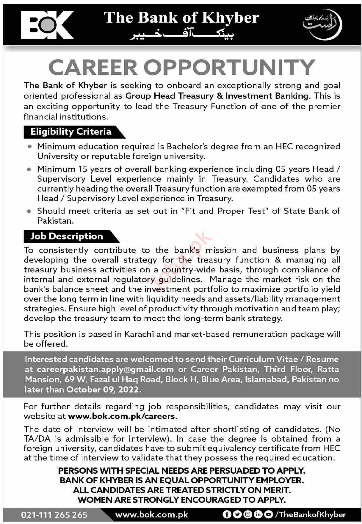 The Bank of Khyber BOK jobs advertisement dated about 26 September 2022 in daily Dawn Newspaper invites application for the vacant post of group head treasury in Karachi, karachi Sindh Pakistan. Candidates with Bachelor and Master etc. educational background will be preferred.