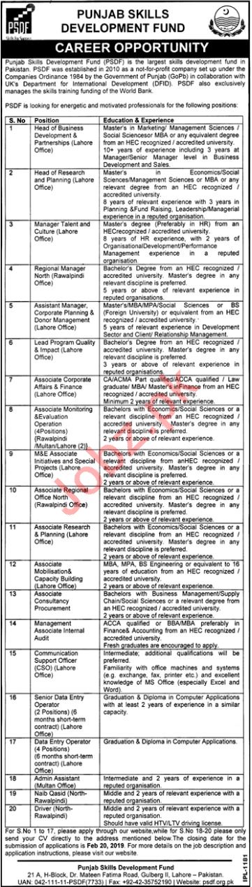 Head of Business Development, Head of Partnership Business, Head of Research, Head of Planning, Manager Talent, Culture Manager, Regional Manager North, Assistant Manager Corporate Planning, Assistant Manager Donor Management, Associate Corporate Affair, Associate Corporate Finance, Associate Monitoring, Associate Evaluation, Associate Regional Office North, Associate Consultancy Procurement, Communication Support Officer, Data Entry Operator, Admin Assistant and Driver Jobs at Punjab Skills Development Fund PSDF in Rawalpindi, Lahore, Multan and Other cities of Punjab.