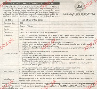 Apply as per details in job advertisement. Login to view further details of how to apply via https://www.jobz.pk online.