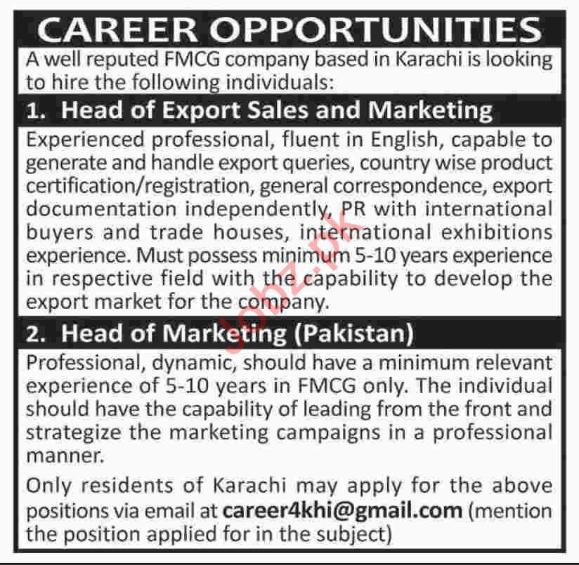 Head Of Export Sales & Marketing Jobs 2020 In Karachi