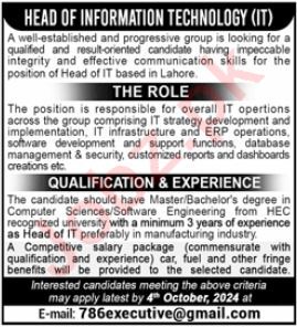 Private Company invites applications for job positions advertised in daily Jang dated 22 September 2024 for following vacancies in Lahore, lahore Punjab Pakistan.