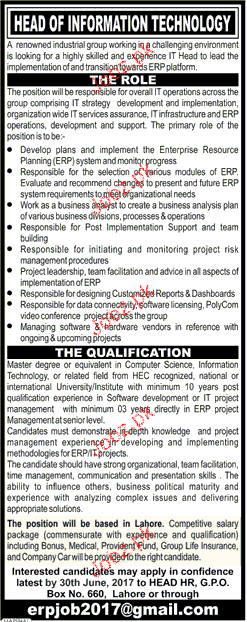 Apply as per details in job advertisement. Login to view further details of how to apply via https://www.jobz.pk online.