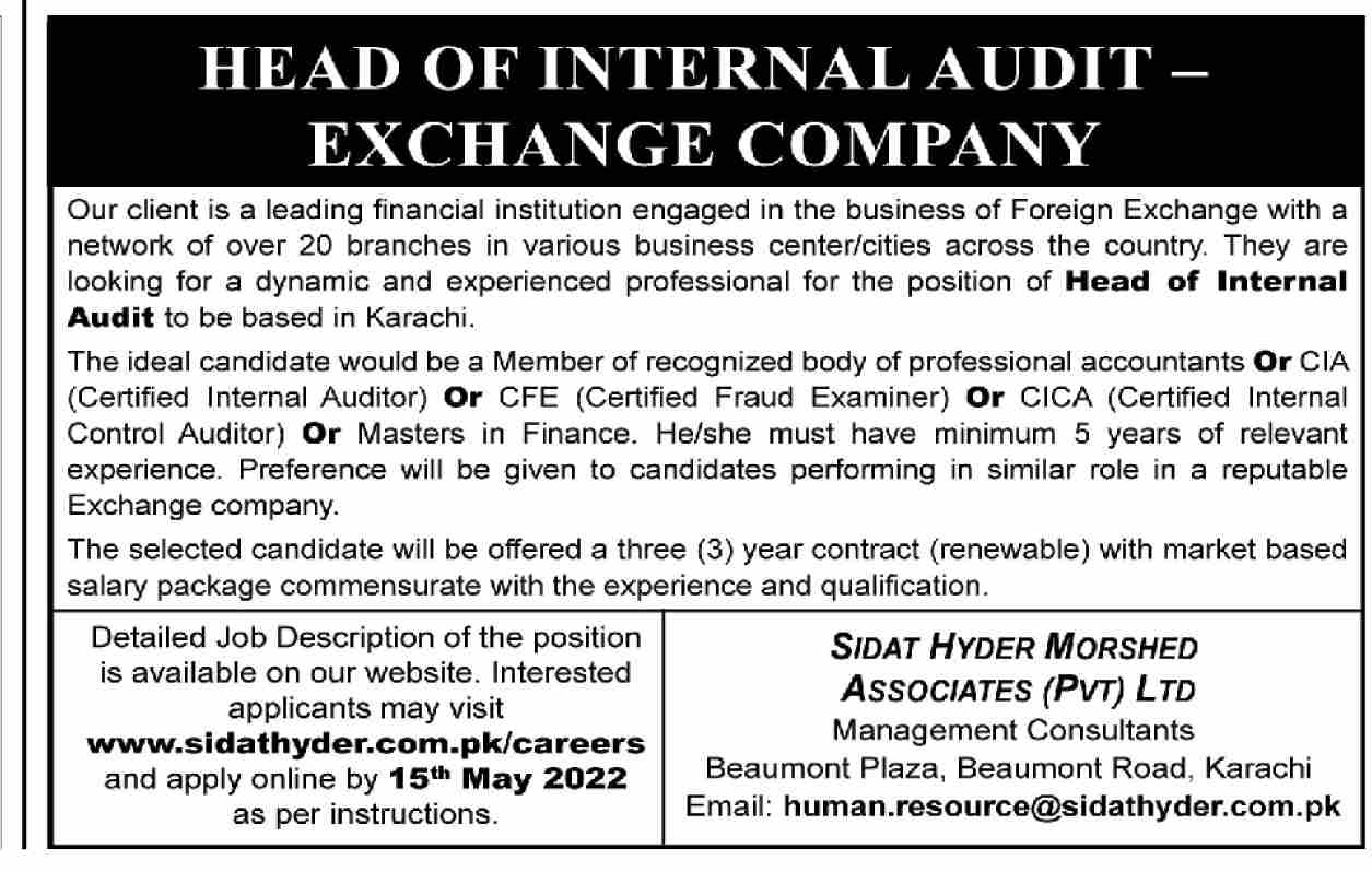 Exchange Company is looking for candidates for following posts as per job advertisement published in daily Dawn Newspaper of April 25, 2022 for location Karachi, karachi Sindh Pakistan: