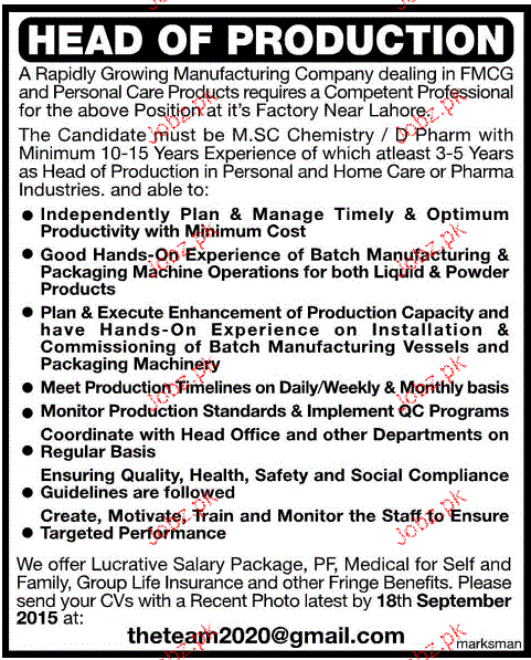 Apply as per details in job advertisement. Login to view further details of how to apply via https://www.jobz.pk online.