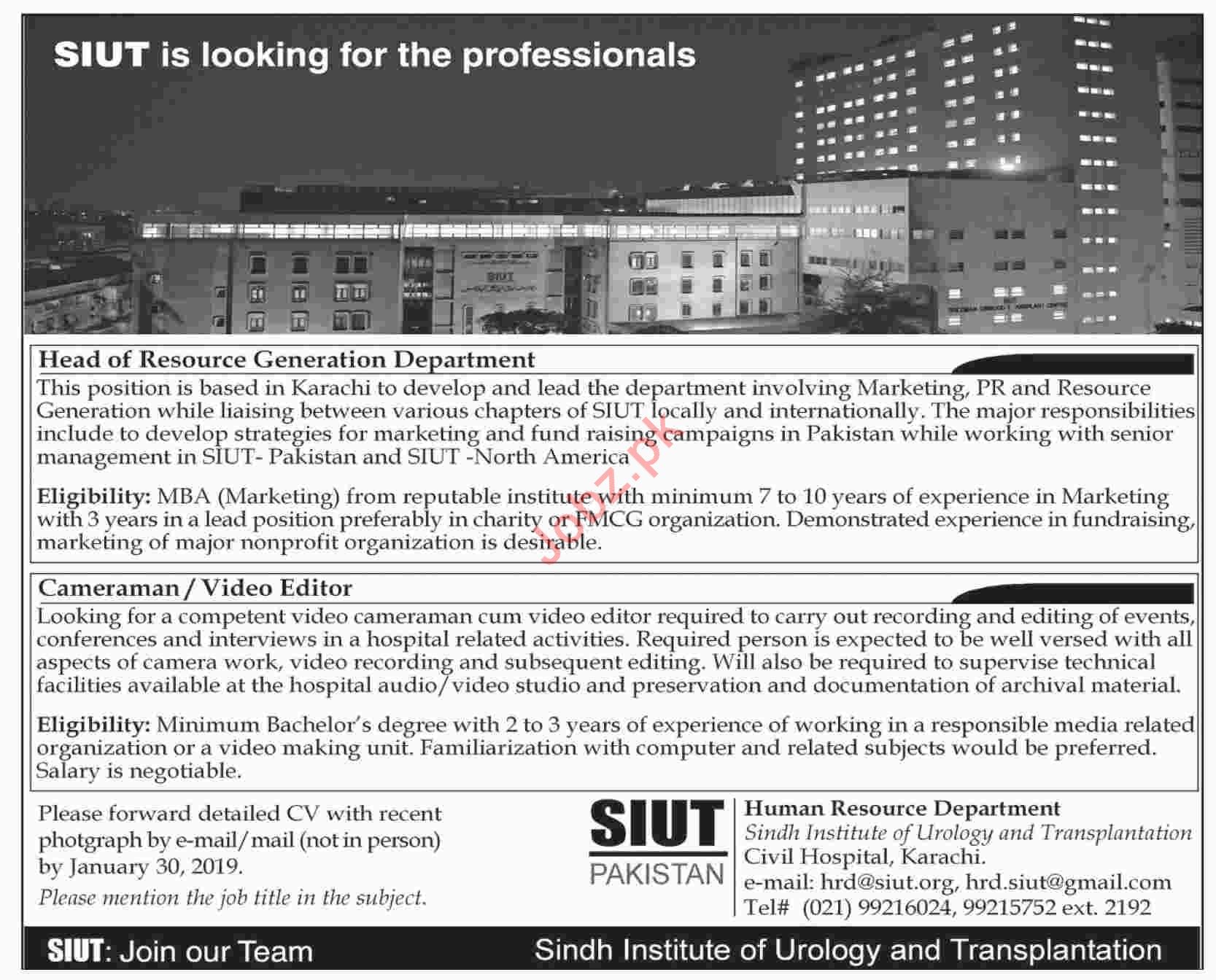 Vacancies in Sindh Institute of Urology and Transplantation Advertisement January 2019