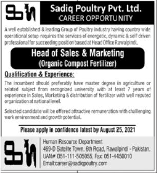 Vacancies in Sadiq Poultry Pvt Limited Advertisement August 2021